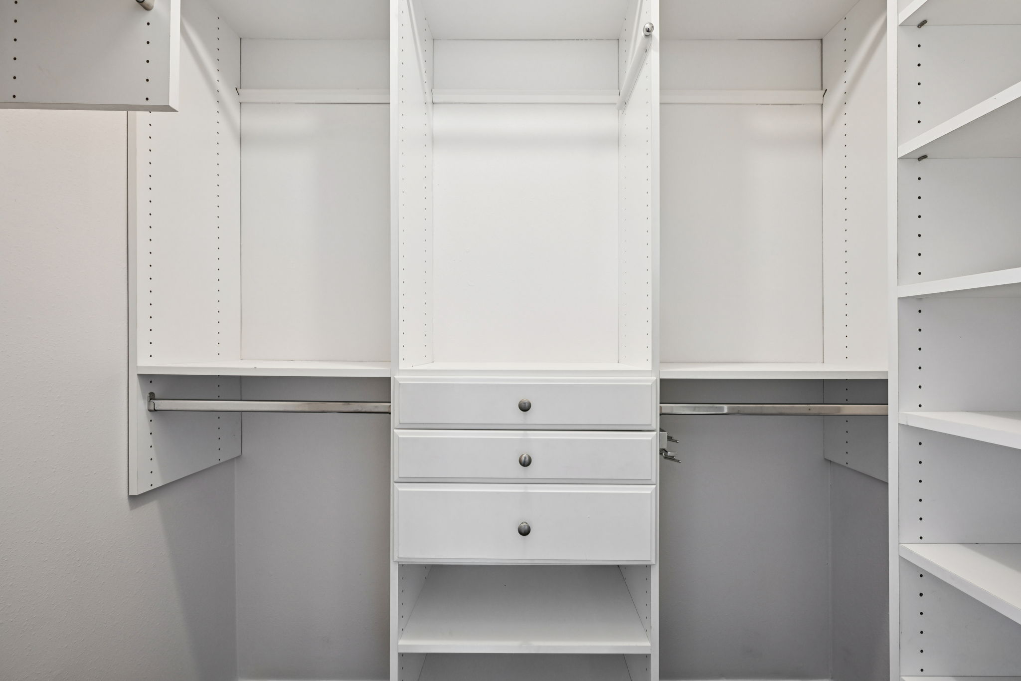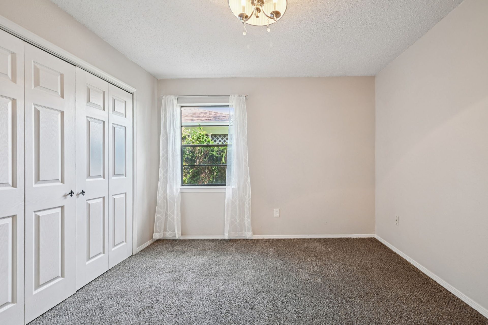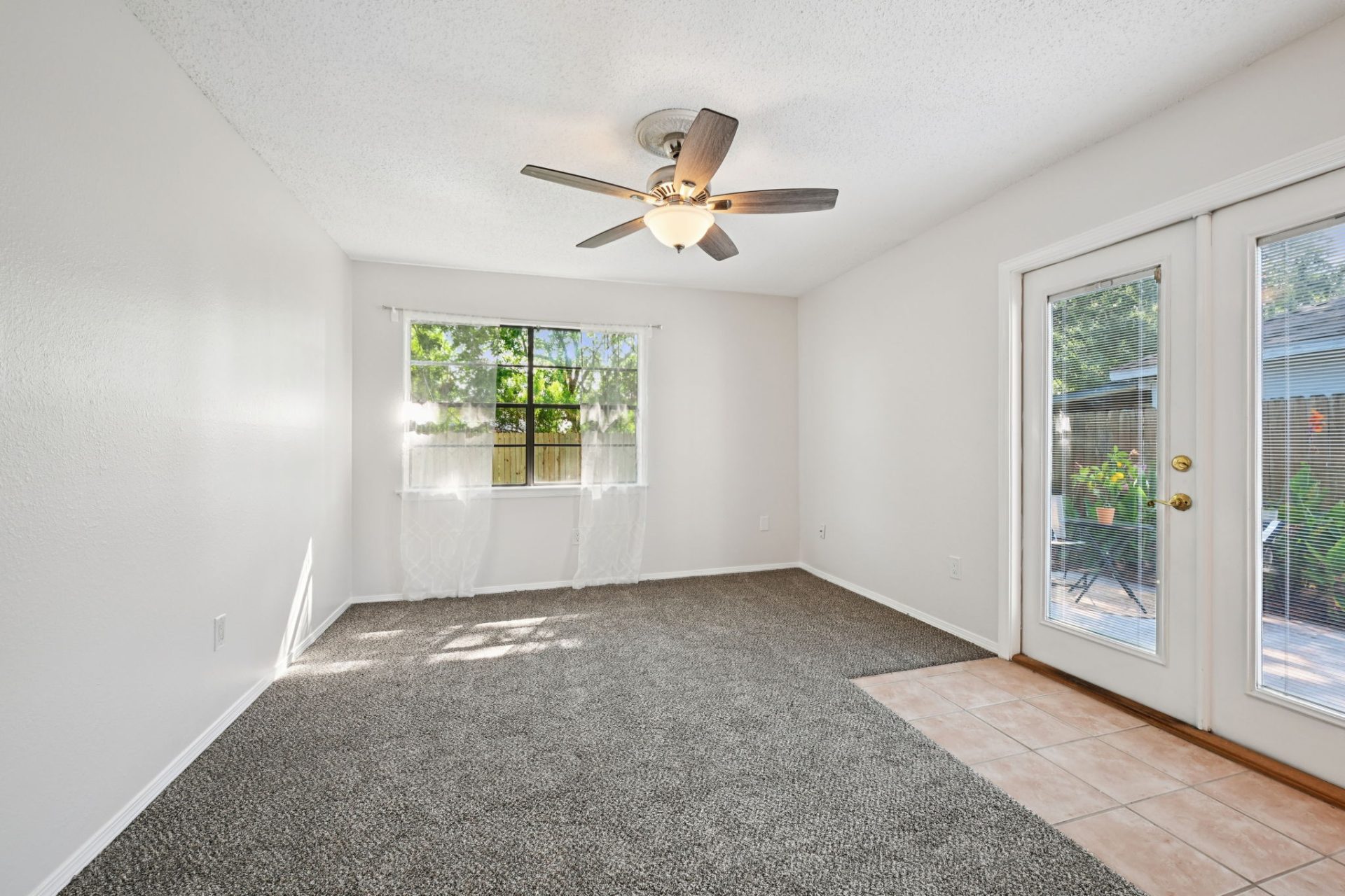 All three bedrooms are generously sized, with soft, refreshed carpet underfoot. The primary suite offers a large custom closet, ensuite bath with dual sinks and marble countertops, and French doors leading to the patio. The hall bath features a freshly refinished tub, a pedestal sink, and plenty of room to move around.
