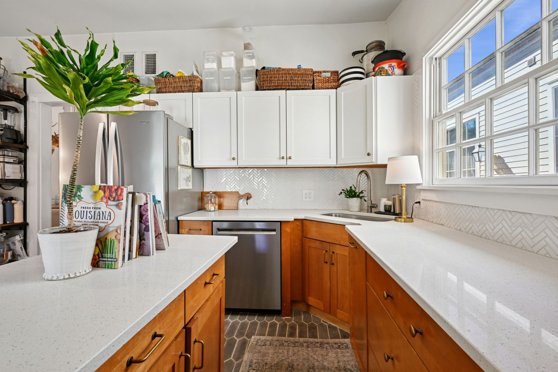 The updated kitchen is a total mood. Featuring quartz countertops, real wood cabinetry, chic newer tile flooring, and stainless steel appliances less than five years old, it’s ready for everything from takeout nights to hosting your favorite people. The built-in dining bench is the perfect spot for brunch, journaling, or homework sessions. And bonus: French doors open right out to the backyard, making indoor/outdoor living a breeze.