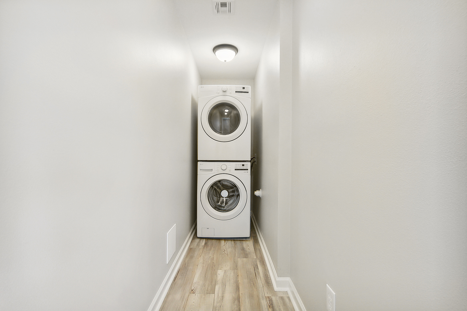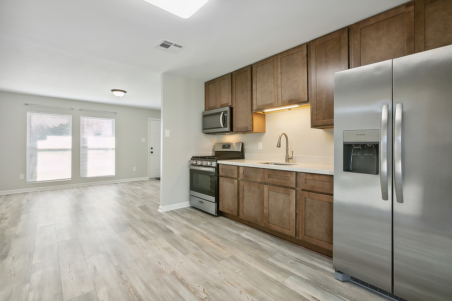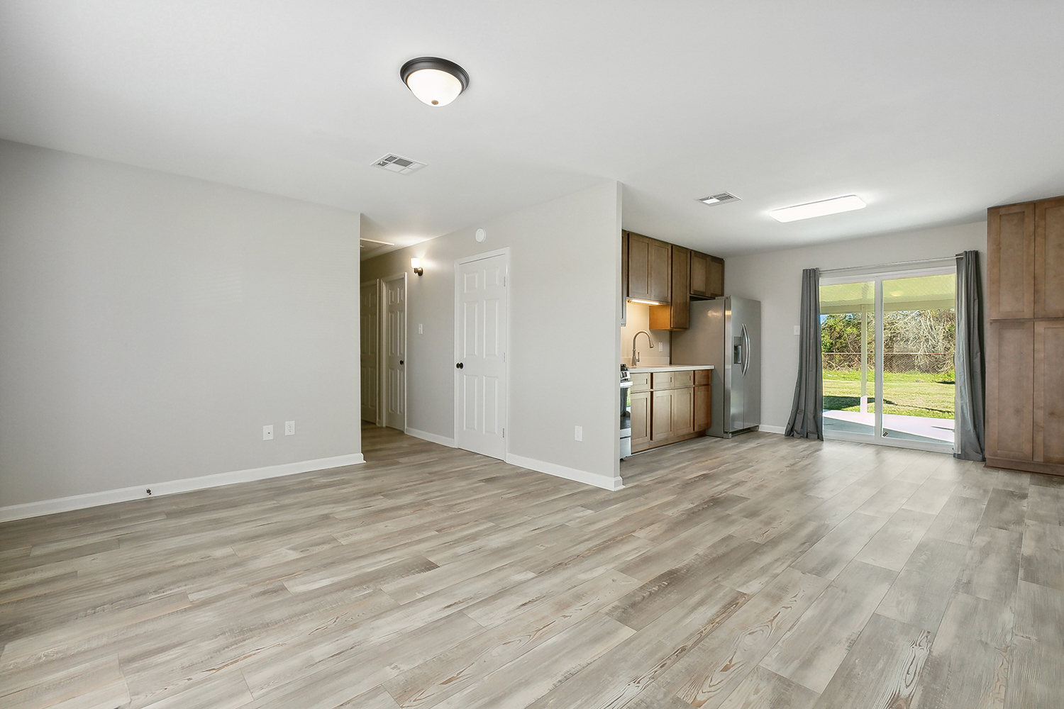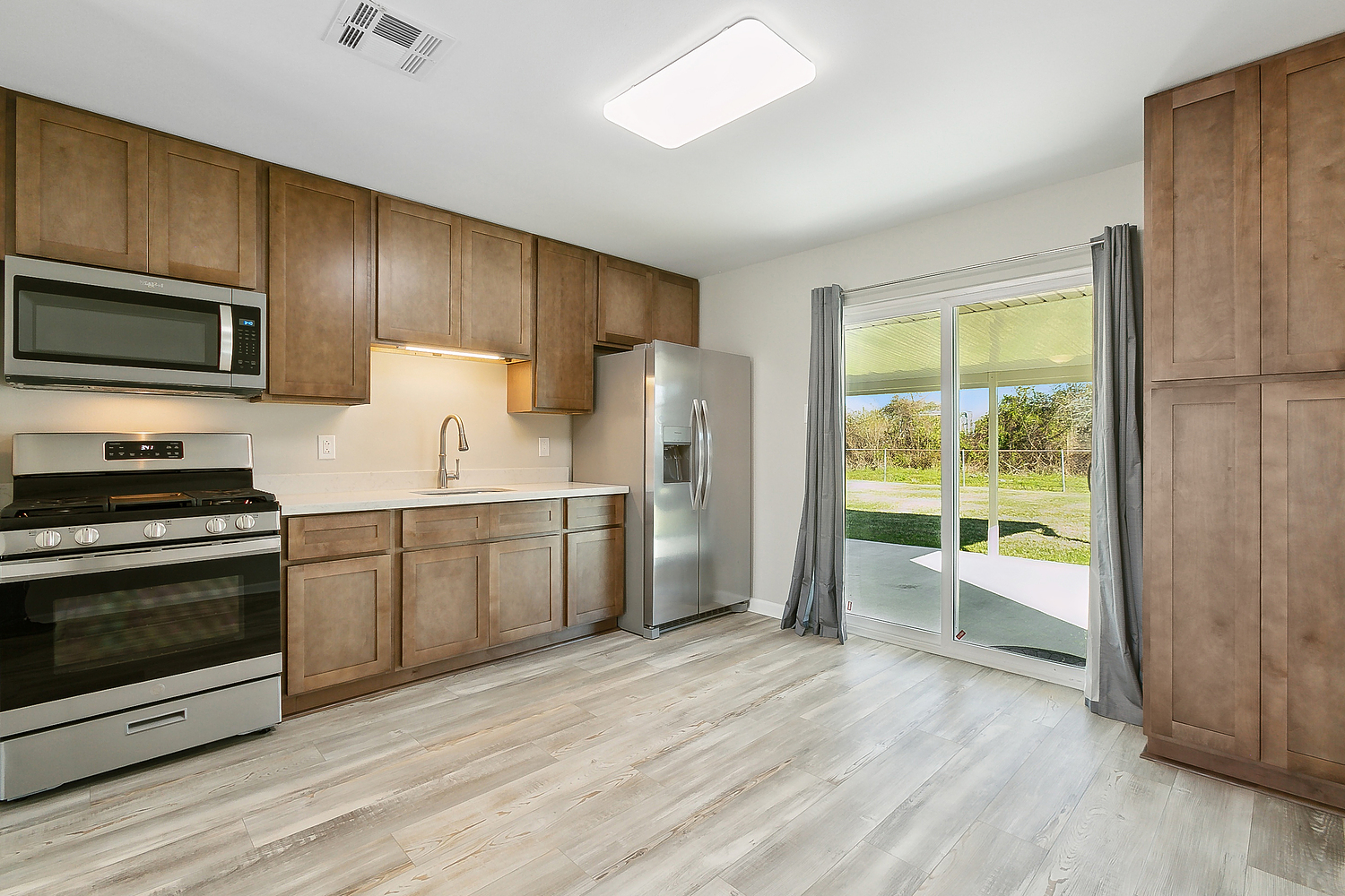The kitchen is as functional as it is stylish. Stainless steel appliances, a spacious pantry cabinet, and plenty of natural light make it a space you’ll actually enjoy cooking in. Sliding glass doors lead directly to the covered patio, so dining al fresco is always an option.