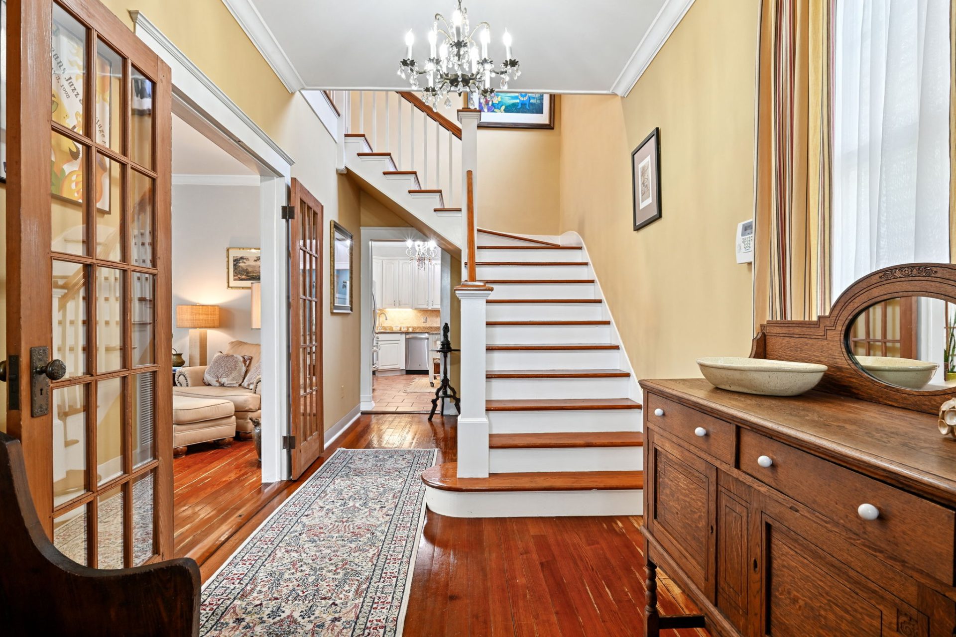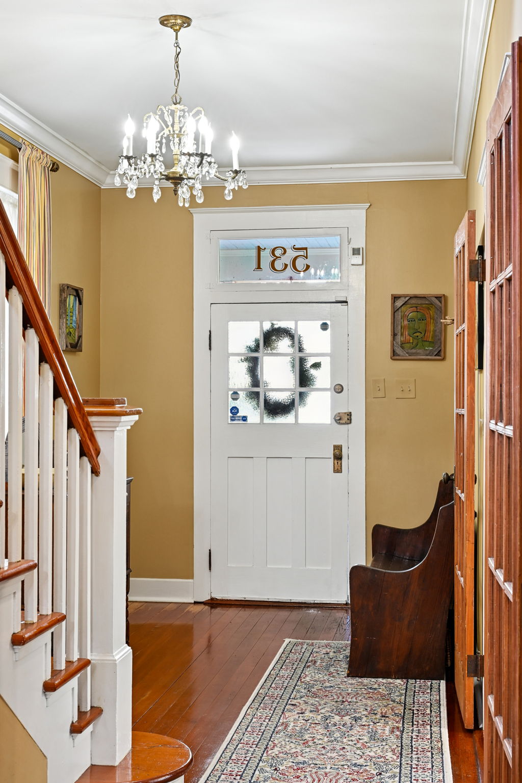 The moment you walk through the front door, the foyer sets the tone—with a transom window, a gorgeous chandelier, hardwood floors, and a grand staircase that instantly says this home has stories to tell. The floor plan is smart, giving you both defined rooms and natural flow—perfect for entertaining or just enjoying your space.