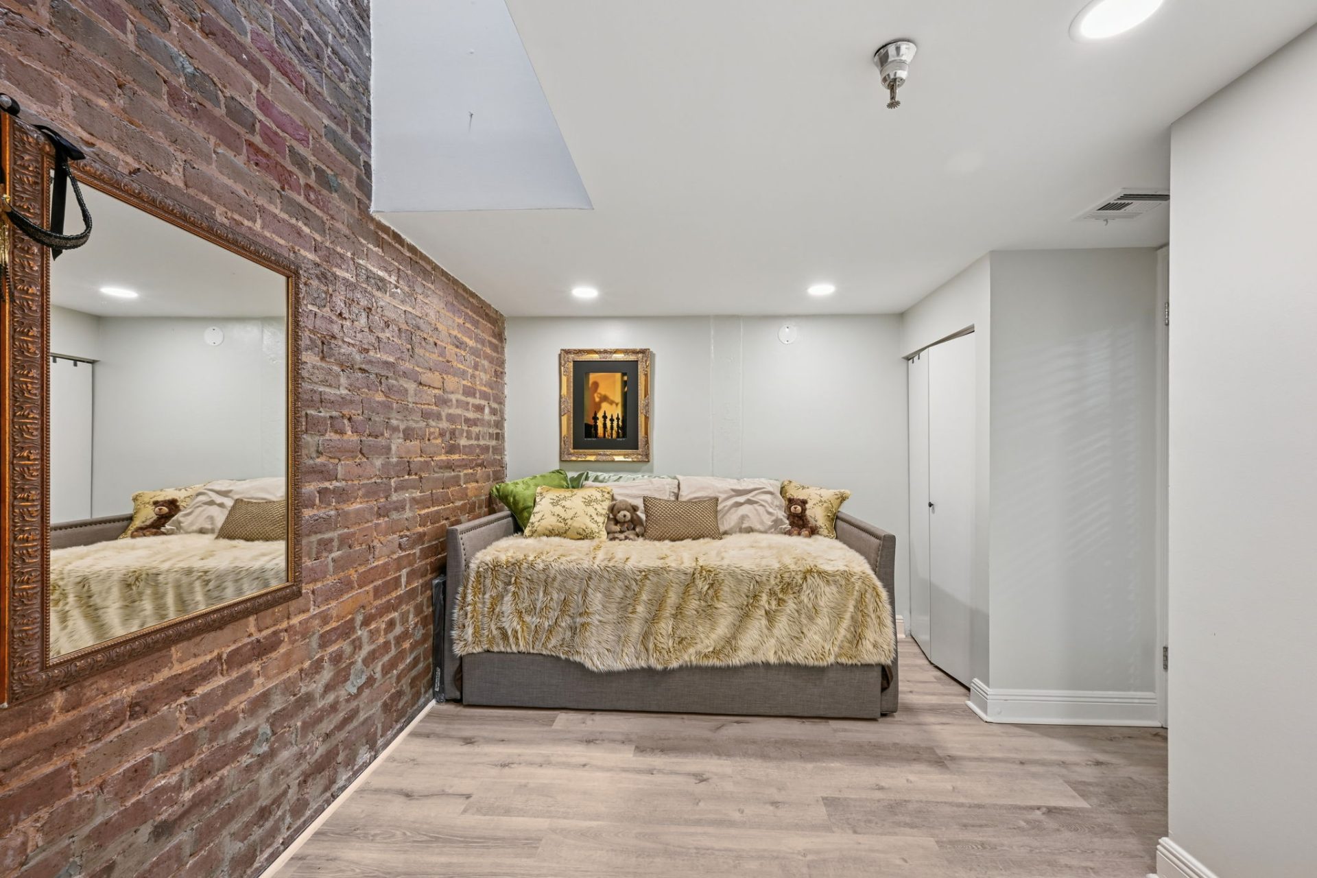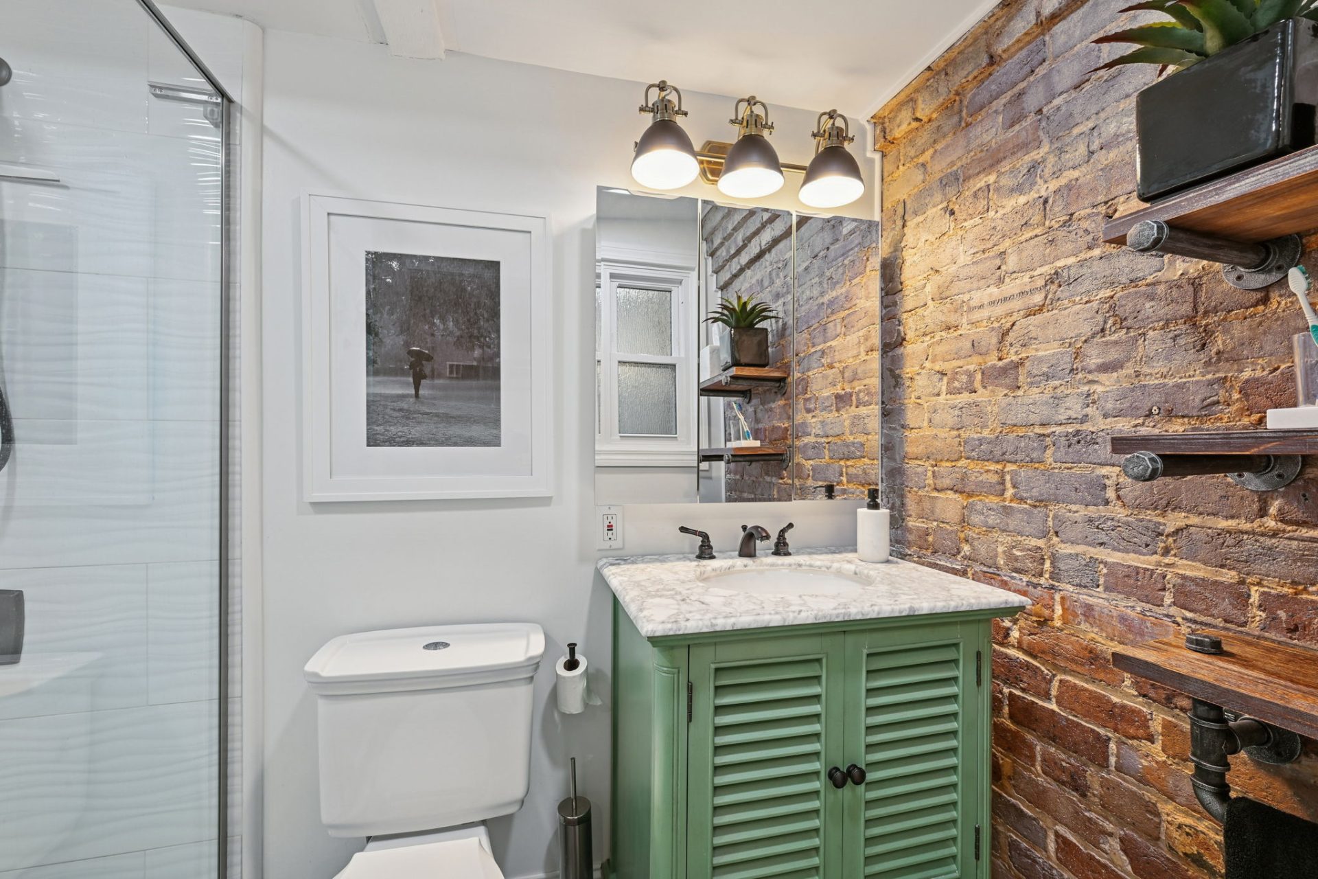 Downstairs, you’ll find a guest bedroom and a convenient half bath that also houses the laundry area. Upstairs, retreat to your primary suite with an attached full bath including brick accent wall — your own private escape above it all.
